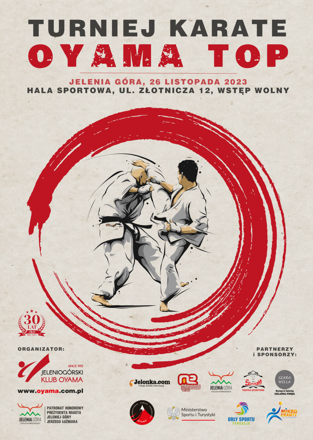 W dniu 26 listopada 2023, w Hali przy ulicy Złotniczej 12 w Jeleniej Górze odbył się Turniej karate OYAMA TOP adresowany do juniorów, z okazji 30-lecia Jeleniogórskiego Klubu OYAMA. Wystartowało blisko 200 zawodniczek i zawodników z 40 klubów, głównie OYAMA karate oraz z 5 klubów KYOKUSHIN karate: z IKO Nakamura (Limanowa), Tezuka Group (Wałbrzych), IFK…